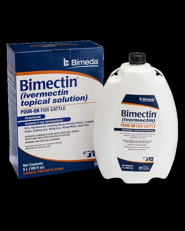 Bimectin Ivermectin Pour-On for kills lung-worms, biting and sucking lice, GI roundworms, grubs, horn flies, mange mites and brown stomach-worms in cattle.